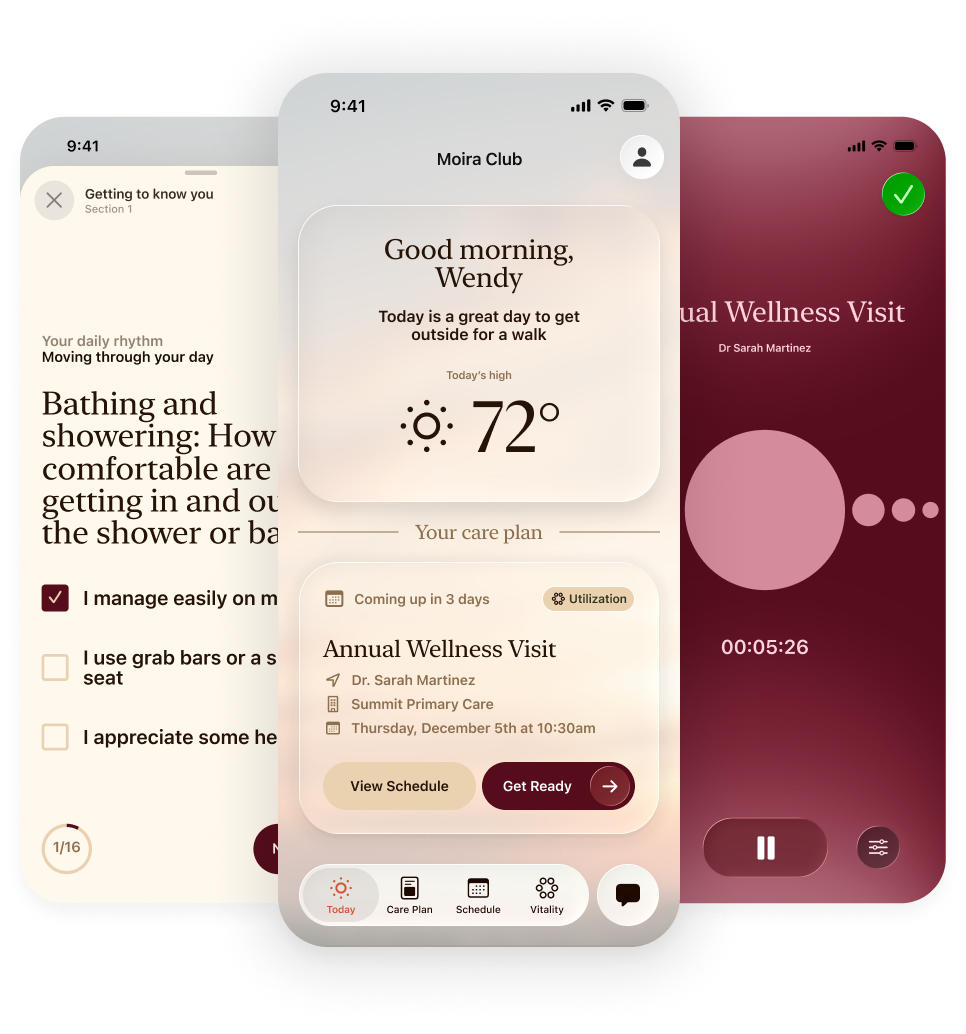 We want more for our aging parents. We want them to to have optimal health, more joyful lives and live where they are most comfortable. Yet, the current systems are reactive, crisis driven, disjointed and overwhelmed. Moira Club, named in honor of our co-founder’s mother, is the concierge wellness membership for our parents, and their generation.